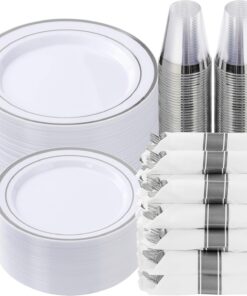 Silver Plastic Dinnerware Set for 50 Guests, Fancy Disposable Plates for Party